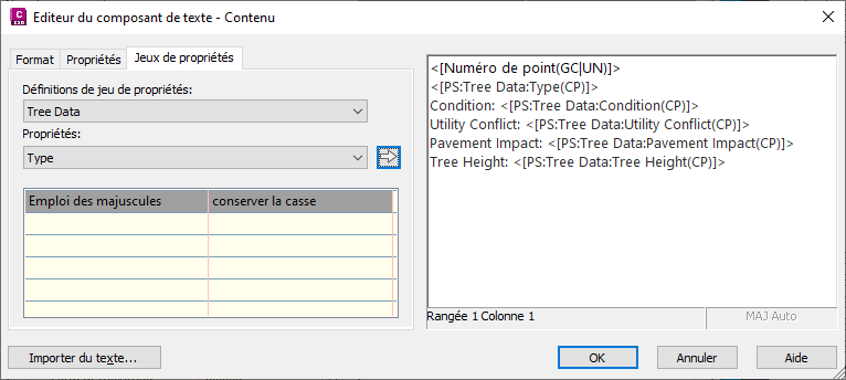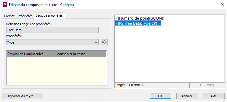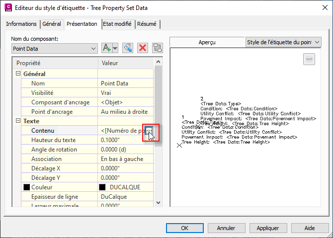 pour insérer la propriété dans la fenêtre de texte. Dans l'exemple suivant, la propriété Type a été ajoutée au style d'étiquette après le numéro du point.