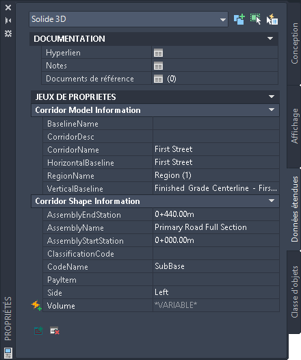 Par défaut, Autodesk Civil 3D comprend trois définitions de jeux de propriétés qui s'appliquent aux projets 3D et aux corps et solides 3D :