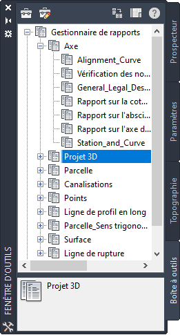 L'onglet Boîte à outils de la fenêtre d'outils est l'interface principale pour l'exécution de rapports et d'extensions. Comme l'onglet Topographie, vous pouvez l'afficher ou le masquer si nécessaire.