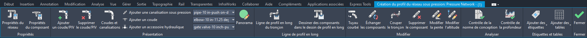 Les composants du réseau sous pression doivent être ajoutés à un dessin de profil en long afin que vous puissiez accéder à ces commandes.