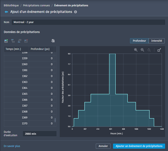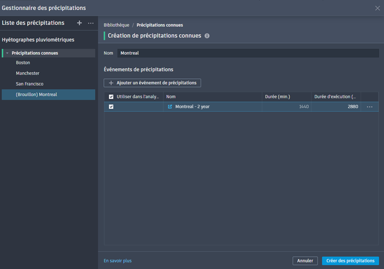 Cliquez sur Ajouter un événement de précipitations pour ajouter l’événement au groupe de précipitations connues. L’éditeur Création de précipitations connues affiche la liste des événements de précipitations mise à jour.