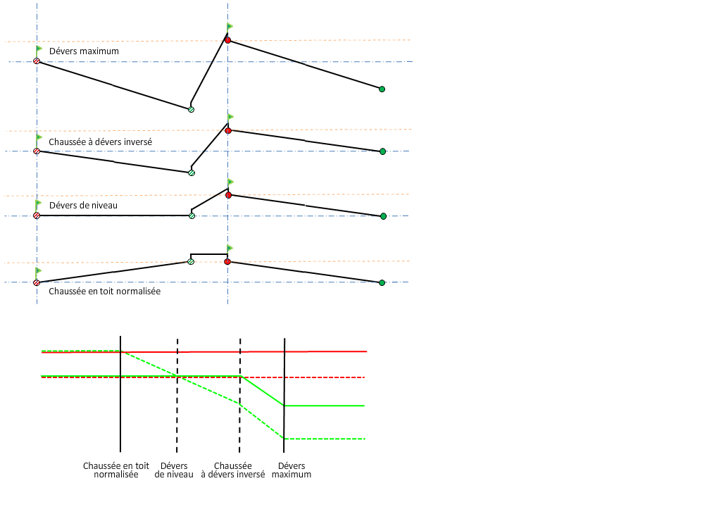 Pour obtenir une explication des diagrammes de dévers, reportez-vous à la rubrique A propos des méthodes de pivot d'axe de rotation du dévers.