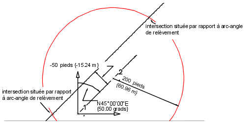 Les intersections sont placées entre un rayon d'arc de 200 avec son centre au point 2 et un angle de relèvement de 50.0000 tracé à partir du point 1 avec une distance de décalage de 50 vers la gauche.