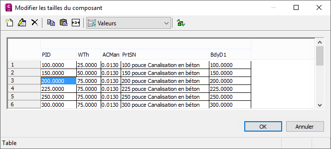 - Pour modifier les valeurs des tailles de canalisation, sélectionnez la rangée et la cellule correspondant à la taille. Cliquez deux fois dessus pour les modifier.