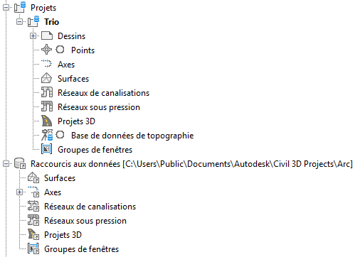 La figure présente les ensembles d'un projet Vault nommé Trio et d'un projet de raccourci aux données nommé Arc. Les deux types de projets sont créés à partir du modèle de projet par défaut. Par conséquent, ils disposent d'ensembles identiques de surfaces, d'axes et d'autres objets qu'il est possible de référencer dans plusieurs dessins.