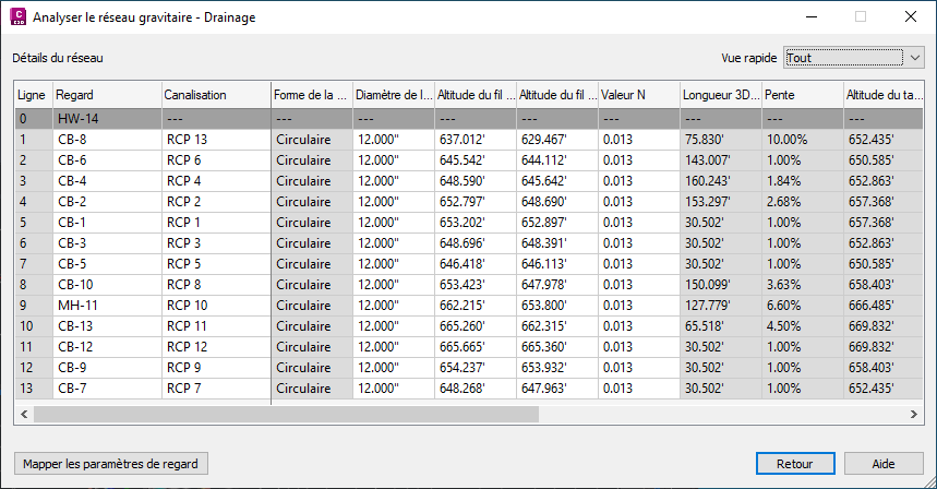 Les erreurs et avertissements s'affichent également sous le tableau et sur la page Général de la boîte de dialogue Analyse du réseau gravitaire, sous le bouton Détails du réseau.