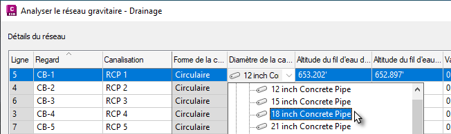 Les tailles de canalisations disponibles dans la liste des composants du réseau de canalisations peuvent être sélectionnées dans une liste déroulante.