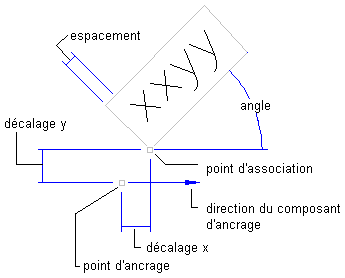 Pour définir la position d'un composant d'étiquette, spécifiez un composant d'ancrage, un point d'ancrage et un point d'association. Les angles de rotation et les décalages X et Y sont appliqués en fonction du composant d'ancrage et du point d'ancrage.