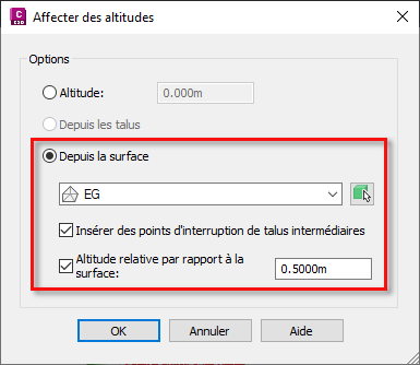 Dans la boîte de dialogue Affecter des altitudes, choisissez l’option Depuis la surface.