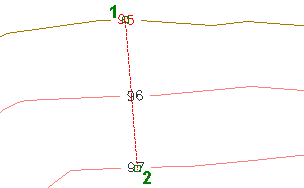 Créez plusieurs étiquettes de courbe de niveau selon un intervalle en dessinant une ligne d'étiquette de courbe de niveau (1) coupant des courbes de niveau de surface et spécifiez l'intervalle (2) entre les étiquettes le long de ces courbes de niveau.