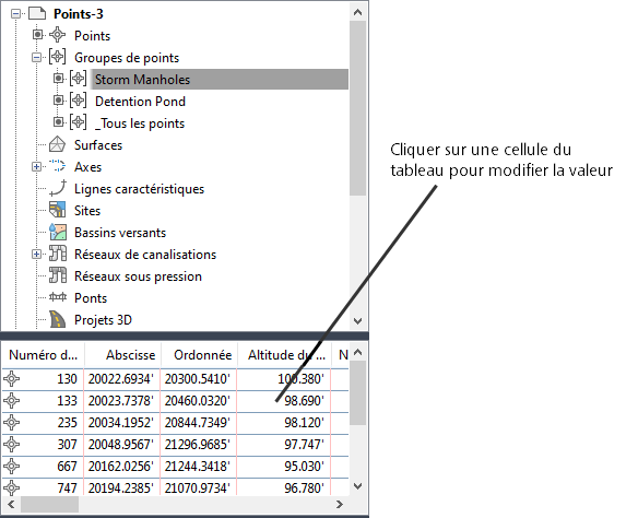 Certains types d'objets, tels que les axes et les lignes de profil en long, utilisent la fenêtre Panorama pour afficher la table des entités composant cet objet.