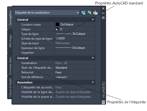 Modification de propriétés AutoCAD pour une étiquette de canalisation