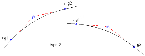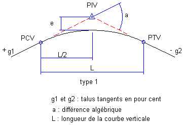 Les profils projets utilisent deux types de courbe : les courbes à point haut et les courbes à point bas. Les courbes à point haut sont placées sur le sommet des collines ou aux endroits où le talus passe à une valeur inférieure. Il existe trois types de courbe à point haut : variation de talus positif à négatif, positif à positif et négatif à négatif :