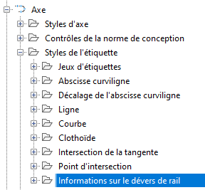 Les styles d’étiquette d’informations sur le dévers de rail sont disponibles dans l’ensemble Styles d’étiquette d’axe :