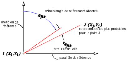 L'illustration suivante indique la géométrie de l'équation d'observation des azimuts/angles de relèvement :