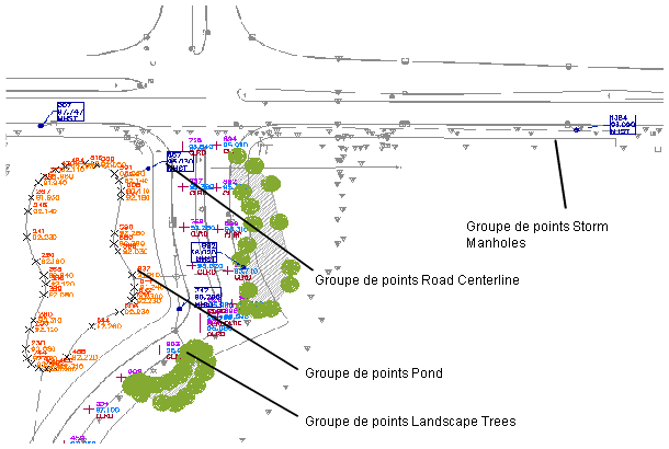 Les groupes de points permettent de les organiser et de contrôler leur apparence dans un dessin. Les groupes de points font directement référence aux données de points et sont responsables du dessin des points. Ils incluent une fonction de remplacement qui force tous les points du groupe à utiliser ce style de point préféré du groupe et le style d'étiquette de point préféré plutôt que les styles affectés aux points individuels.