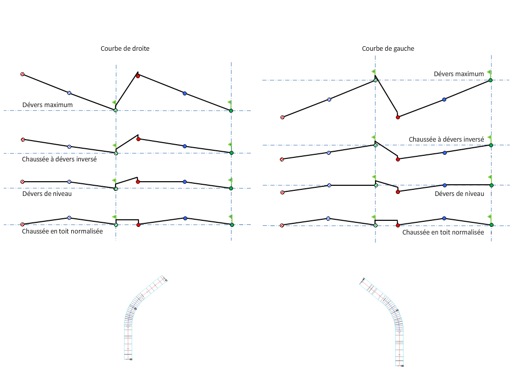 Pour obtenir une explication des diagrammes de dévers, reportez-vous à la rubrique A propos des méthodes de pivot d'axe de rotation du dévers.
