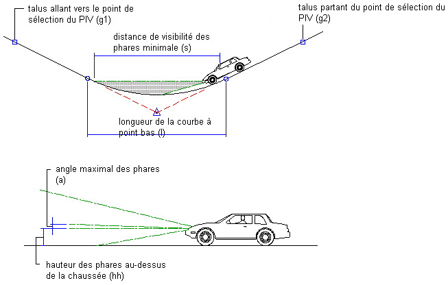 Cette méthode de conception des courbes à point bas donne une longueur de courbe minimale. La courbe doit être suffisamment longue pour que dans des conditions de conduite dans l'obscurité, les phares d'un véhicule standard illuminent la route jusqu'à une distance de sécurité au-delà de la distance d'arrêt pour la vitesse nominale de déplacement.