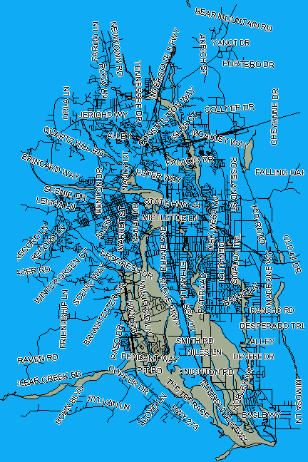 Vous pouvez afficher la superficie de la zone d'activités qui se trouve dans la zone inondable. Toutefois, il est difficile d'identifier des rues spécifiques sans carte des routes. Dans cette leçon, vous allez ajouter un calque de routes et l'étiqueter avec des noms de rues. De cette manière, vous pouvez identifier plus facilement les rues de la zone inondable.