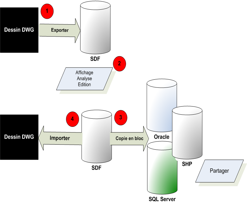 | Exportez votre carte ou des calques de dessin individuels au format Autodesk SDF, ou SHP ou Oracle. Utilisez ensuite l'option Copie par lot pour les déplacer dans d'autres formats. | Les données DWG d'origine sont inchangées. |