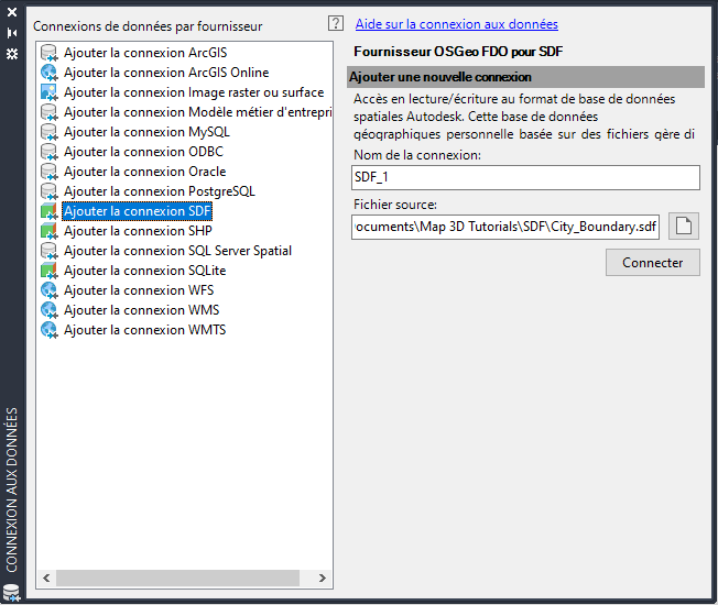 - Dans la fenêtre Connexion aux données, sous Connexions de données par fournisseur (à gauche), sélectionnez Ajouter la connexion SDF.