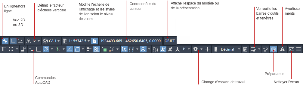 Les instructions pour la commande active remplacent certains éléments de la barre d'état. Certains éléments n'apparaissent qu'au cours d'une opération, par exemple lors de la publication ou du traçage.