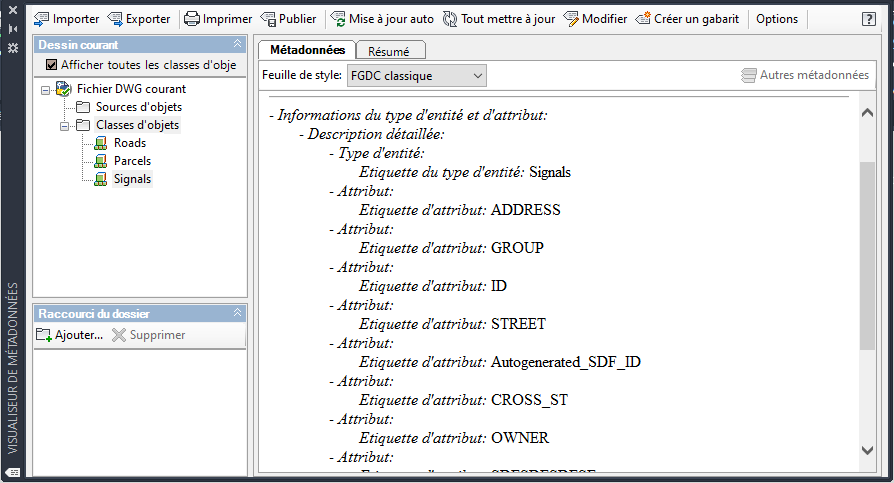 Si un dessin contient des objets classifiés, ses métadonnées sont automatiquement générées et affichées lorsque vous ouvrez le visualiseur de métadonnées pour la première fois.