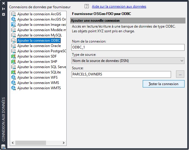 Dans la fenêtre Connexion aux données, spécifiez la nouvelle connexion. N'ajoutez pas à la carte de calque de classe d'objets spécifique à partir de la source ODBC. jeu d’outils AutoCAD Map 3D dispose automatiquement de toutes les informations nécessaires lors de la connexion à la source ODBC.