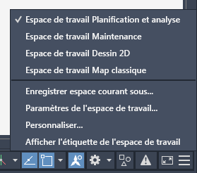 - Espace de travail Planification et analyse avec ruban : personnalisé pour les commandes d'jeu d’outils AutoCAD Map 3D. La plupart des didacticiels et des vidéos supposent que vous utilisez cet espace de travail.