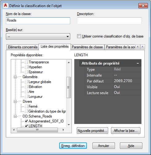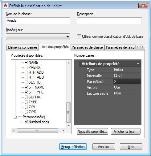 Par exemple, pour pouvoir modifier globalement le calque, le type de ligne ou la couleur de tous les membres de la classe Roads, sélectionnez ces propriétés. Vous pouvez, dans les cas appropriés, définir des valeurs par défaut. Par exemple, vous pouvez affecter tous les membres de la classe Roads à un calque Roads.