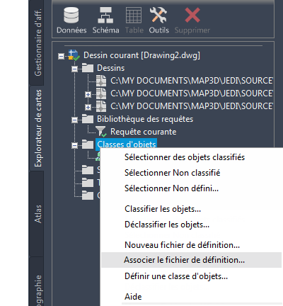 - Associez le fichier de définition d'objet en cliquant avec le bouton droit de la souris sur Classes d'objets sur l'onglet Explorateur de cartes du volet Tâches, puis en choisissant Associer le fichier de définition.