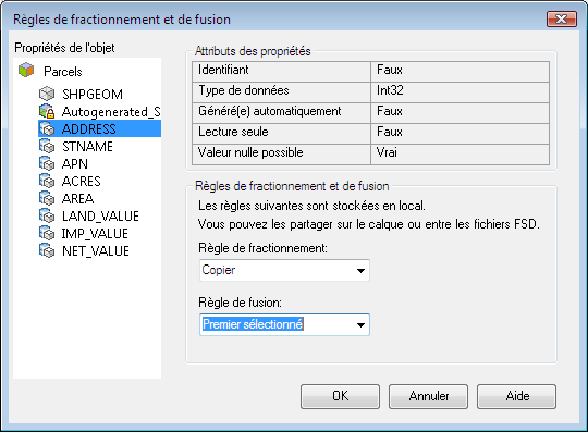 Avec la commande Fractionner, vous pouvez définir des règles d'attribution des propriétés lorsque vous fractionnez et fusionnez des objets géospatiaux. Vous pouvez faire appel à des expressions pour définir ces règles.