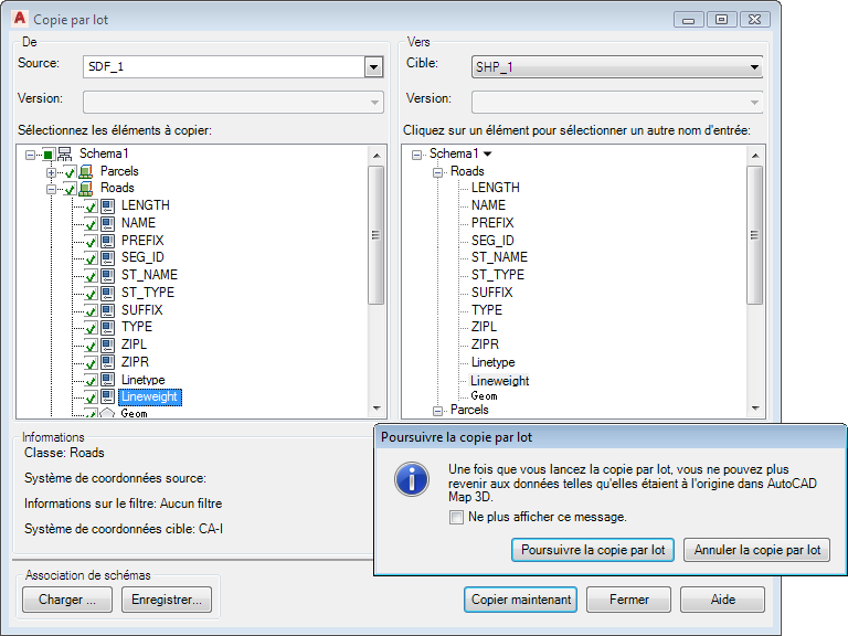 Vous allez copier le calque Roads du format SDF vers le format SHP à l'aide de la fonction Copie par lot.