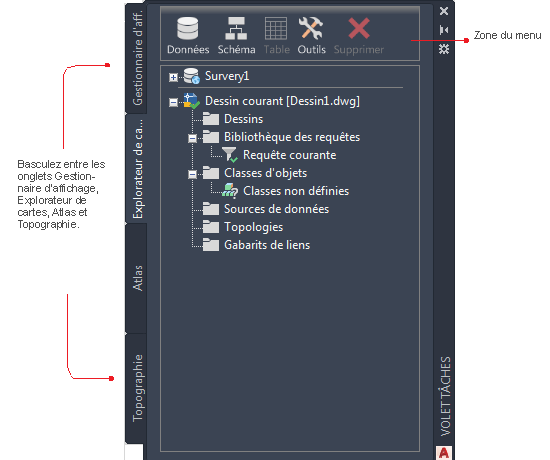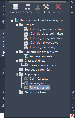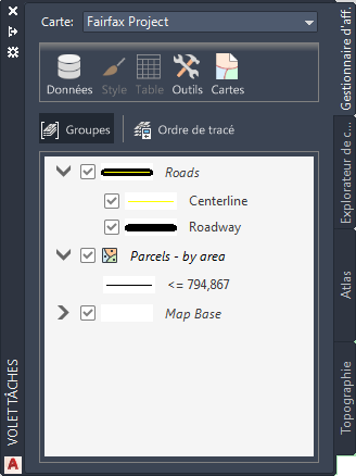 Le volet Tâches permet d'accéder rapidement aux objets fréquemment utilisés et de les regrouper dans des vues associées aux tâches. Le volet Tâches vous permet de créer, de gérer, d'afficher et de publier des cartes.