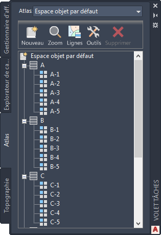 Utilisez l'onglet Atlas pour créer des cartes imprimées, des atlas et des fichiers DWF de plusieurs pages à partir de cartes stylisées. L'atlas utilise le gestionnaire du jeu de feuilles d'AutoCAD et affiche une arborescence des tuiles de l'atlas, comparable aux pages d'un atlas. Utilisez les flèches de navigation pour passer d'une tuile à l'autre dans votre carte.