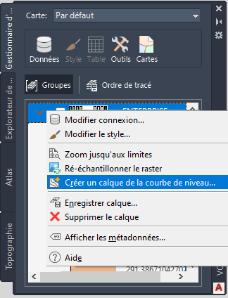 - Dans le Gestionnaire d’affichage, cliquez avec le bouton droit de la souris sur un calque de surface, puis choisissez Créer un calque de la courbe de niveau.