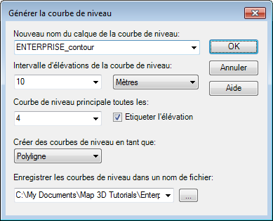 - Dans la boîte de dialogue Générer la courbe de niveau, dans la liste Intervalle d’élévations de la courbe de niveau, sélectionnez 20.