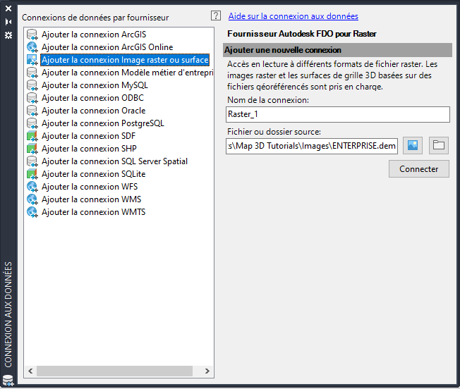 - Dans la fenêtre Connexion aux données, sous Connexions de données par fournisseur, cliquez sur Ajouter la connexion Image raster ou surface, puis sur