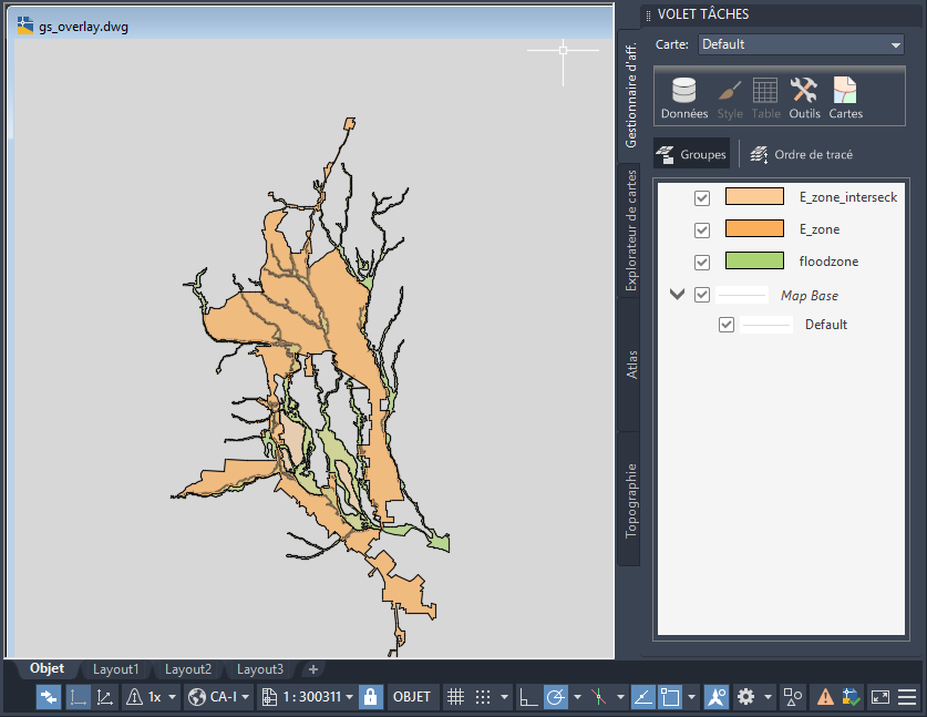 Cette carte superpose deux calques (une zone inondable et une zone industrielle). Vous pouvez utiliser la superposition pour voir où se situe l'intersection de ces deux zones. Cette zone d'intersection devient un nouveau calque que vous pouvez styliser et enregistrer dans un fichier, puis utiliser comme banque de données distincte.