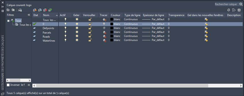 Les calques du dessin sont répertoriés avec leurs propriétés.