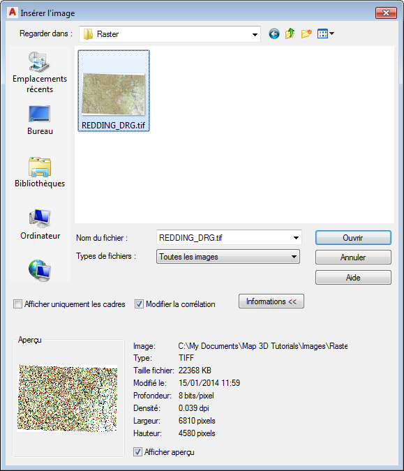 Cet exercice consiste à insérer un graphique raster numérique (DRG) de la ville de Redding en Californie dans un dessin de cette même ville. Les informations du fichier TIFF World (TWF) associé vous permettent de localiser et de mettre à l'échelle l'image.