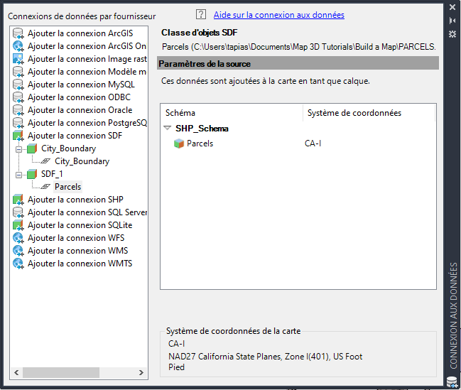 La fenêtre Connexion aux données affiche des informations sur toutes les sources de données associées autres que DWG, même si vous ne l'avez pas utilisée pour associer ces dernières. Par exemple, le fichier SDF que vous avez fait glisser dans votre carte est répertorié dans la fenêtre Connexion aux données.
