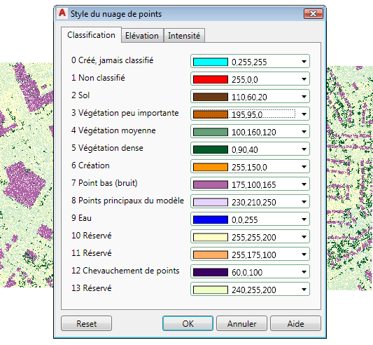 nuages de points par classification, élévation, intensité LiDAR et valeurs RVB.