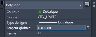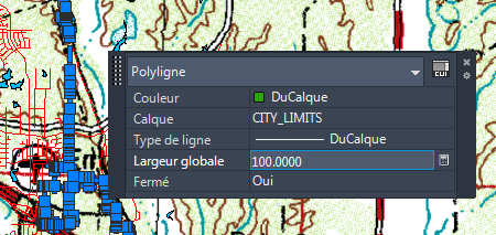 Cet exercice consiste à modifier la largeur de la polyligne représentant les limites de la ville. Les limites de la ville seront alors plus visibles dans le dessin. Vous allez ensuite délimiter l'image pour n'afficher que la partie rectangulaire qui entoure la ville.