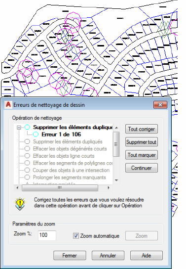 Les outils de nettoyage de dessin vous permettent d'automatiser la correction d'erreurs de dessin et de numérisation courantes. Vous pouvez supprimer les éléments dupliqués, corriger les segments manquants et les objets libres, entre autres.