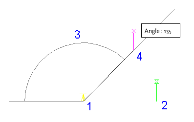 La commande COGO Angle de fléchissement/distance permet de spécifier un point en indiquant un angle de fléchissement et une distance par rapport à un autre point.