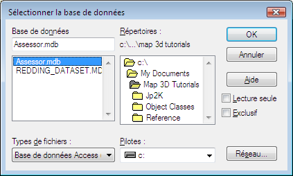 - Dans la boîte de dialogue Sélectionner la base de données, accédez aux fichiers d'exemple et sélectionnez Assessor.mdb.