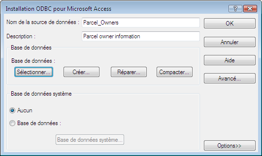 - Dans la boîte de dialogue Installation ODBC pour Microsoft Access, pour Nom de la source de données, entrez Parcel_Owners.