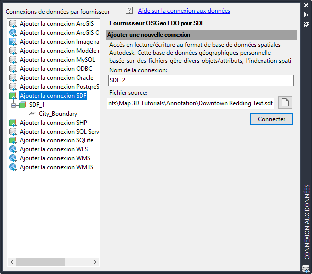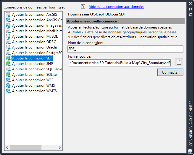 Sélectionnez le fournisseur SDF et accédez au fichier d’exemple (CITY_BOUNDARY.SDF).