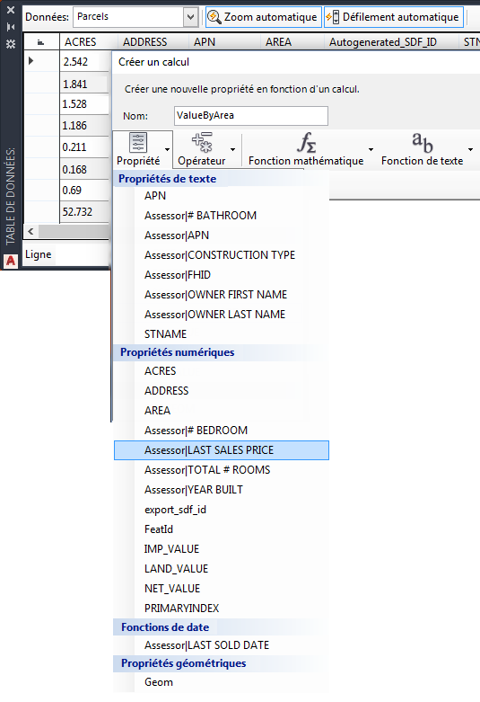 Vous avez joint les données des propriétaires au calque Parcels et enregistré les résultats dans une nouvelle banque de données. Vous pouvez utiliser les informations combinées pour créer une propriété calculée. Celle-ci est le résultat d'une expression, dans ce cas, le dernier prix de vente divisé par la superficie.